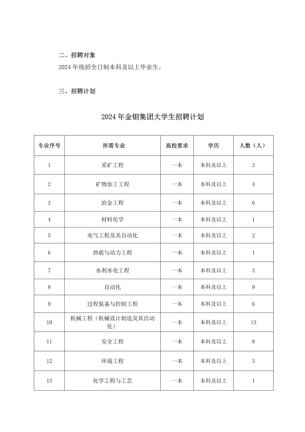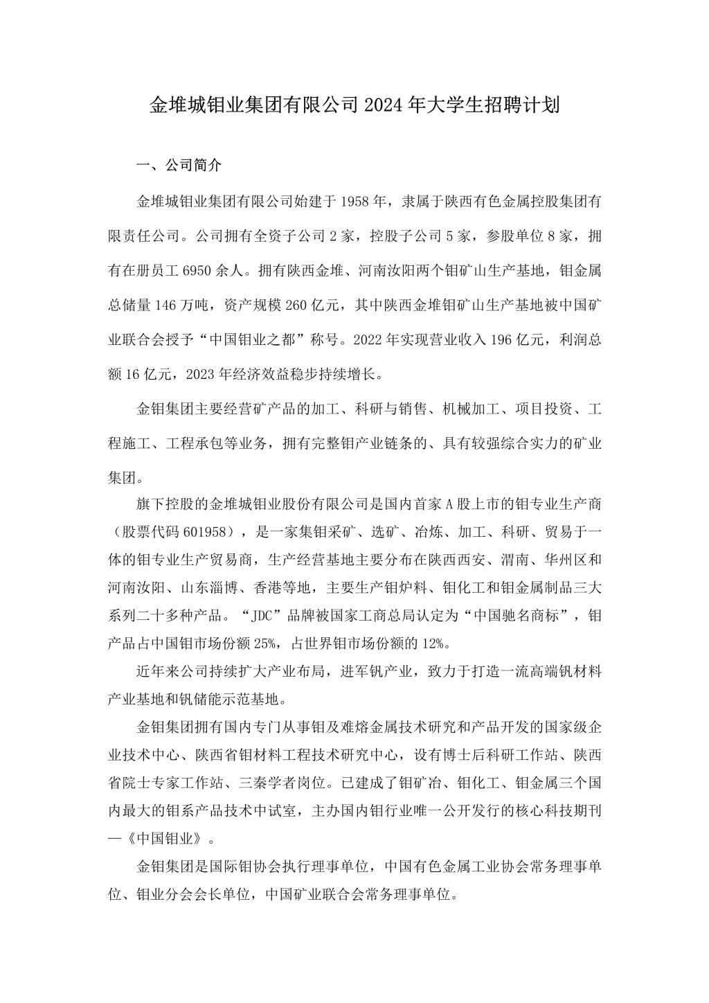 金堆城钼业集团有限公司2024年大学生招聘计划