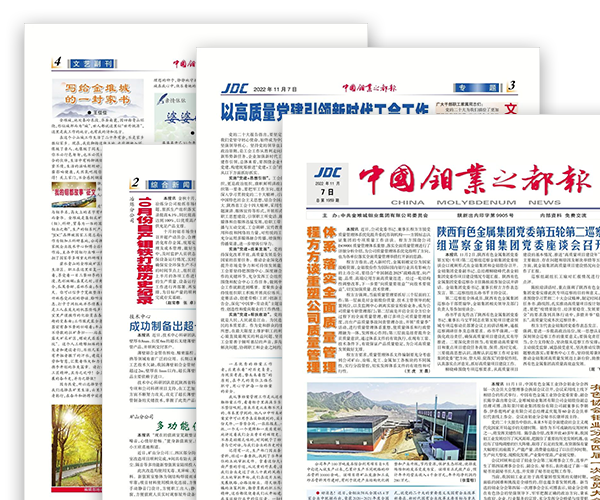 《中国钼业之都报》属企业内部刊物,创刊于1973年11月22日,刊号为“陕新出内印字第9905号”,最早名为《战报》、《金堆矿报》报等,2007年更名为《中国钼业之都报》并沿用至今,创刊50年来已刊发近2000期。报纸为周报,有公司要闻、综合新闻、专题、文艺副刊四个版面,每周一出报,并在金钼融媒、微信公众号等平台以电子报推出。创刊以来,报纸坚持以“服务企业发展、关注钼都焦点、讲好身边故事、凝聚发展合力”为宗旨,积极发挥信息传播的桥梁纽带作用,围绕企业生产经营中心工作,唱响主旋律,打好主动仗,不断提高舆论引导水平和新闻宣传质量,是金钼集团宣传思想文化建设的一个重要阵地。